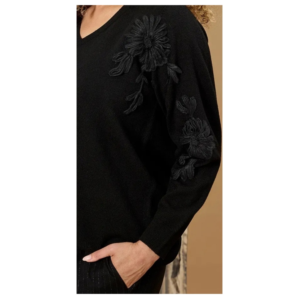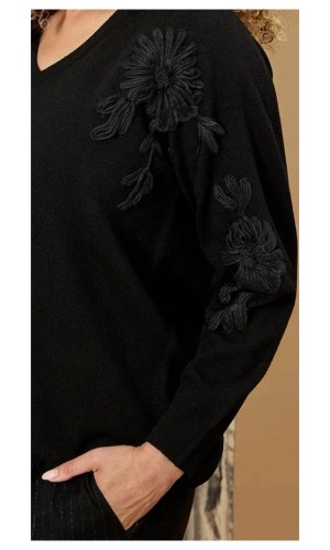 - Mooie zwarte trui met opdruk op de arm en op schouder aan 1 zijde.