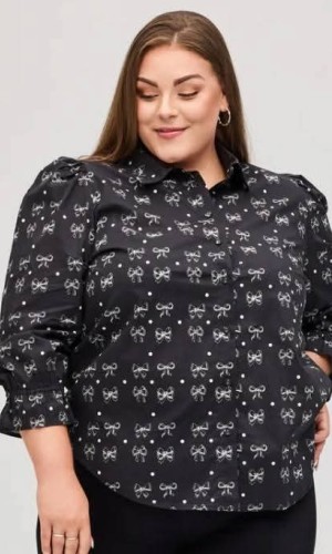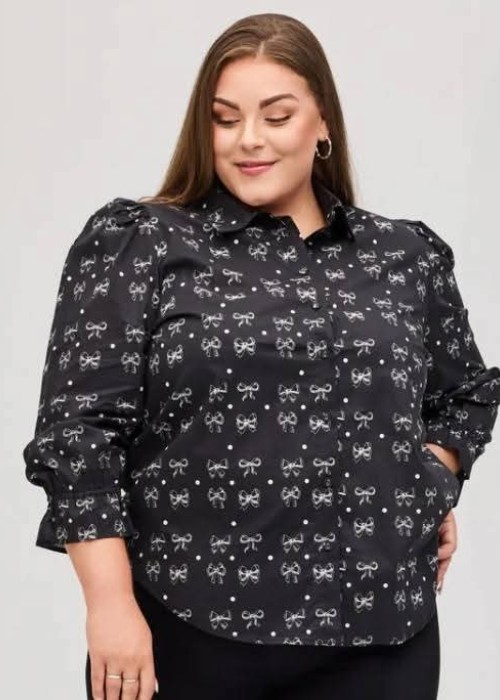 - NO1.BY OX shirt w puff and 3/4 sleeves w flair cuffs style 63141 colour vlack w white bows met mooie print.
