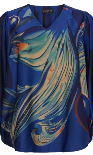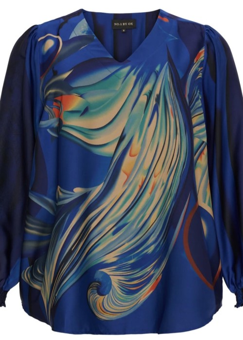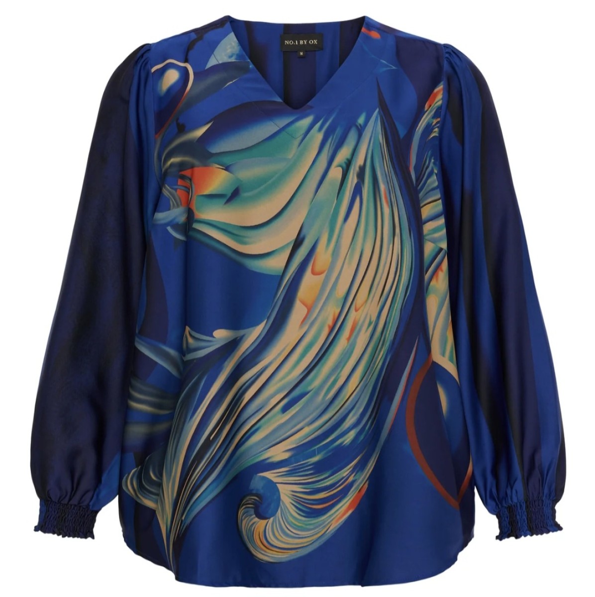 - NO1. BY OX v neck blouse and ls smock cuffs styeno 63138 colour Dark cobalt blue w big graphic print.